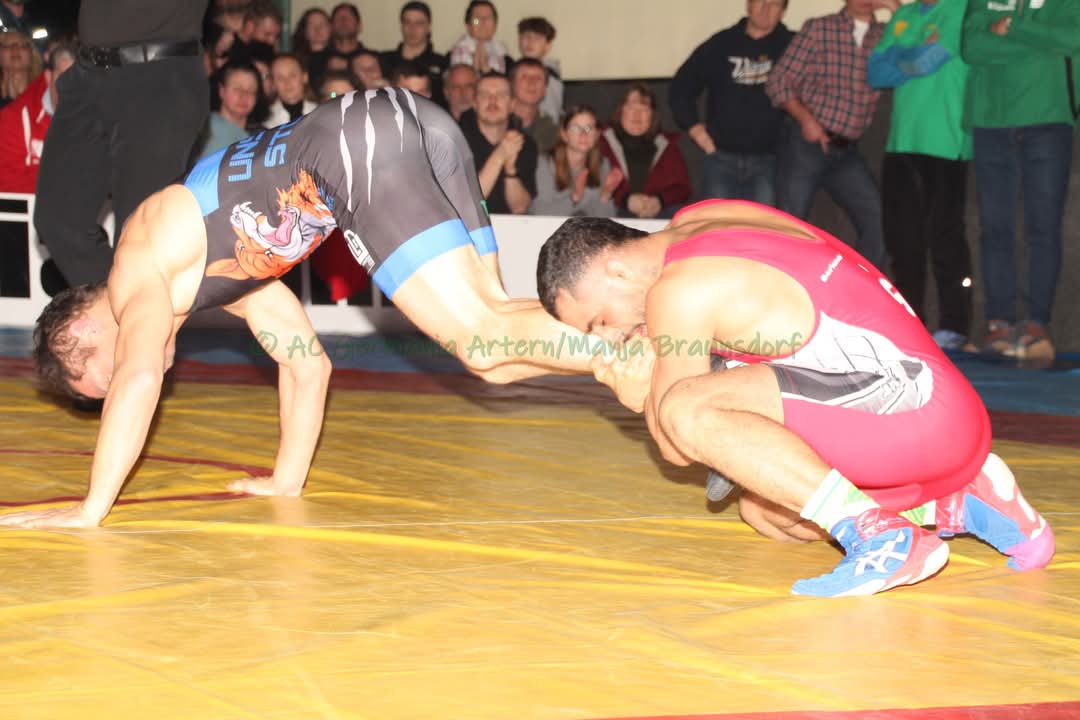 Bis 66 kg Freistil war Omid Sayadi an der Reihe. Sein Gegner war – ein altbekannter Germane – Steve Brylla. Omid kämpfte wie gewohnt sehr konzentriert. Nach kurzem Abtasten legte er mit einem schönen Armdrehschwung los, aus dem sich Steve nur schwer, aber noch lmapp vor der Schulterniederlage, erfolgreich befreien konnte. Direkt danach fand sich Steve in einer Beinschraube wieder und verletzte sich dabei. Gute Besserung an dieser Stelle an Steve! Omid feierte zusammen mit den Fans die ersten vier Punkte für den AC Germania.