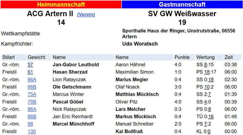 Ole Getschmann (66kg) hatte es im Anschluss mit dem routinierten Olaf Noack zu tun. Konditionell überlegen sicherte sich Ole Zielstrebig seine Punkte und siegte am Ende mit 10:2. Nick Ratayczak (86kg) fand gegen Lars Melcher nicht in den Kampf und verlor nach Punkten. Als dann auch Marcus Winter (75kg) gegen gegen Matthias Mückisch verlor, stand die Heimniederlage fest.
