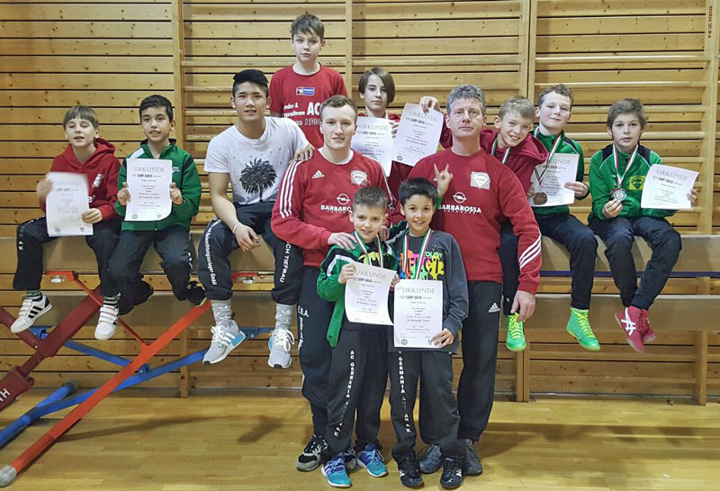 In der D-Jugend kämpften fünf Junge-Wilde um die Medaillen. Den Anfang machte der Leichteste, Calvin Daras. 25 Kilo brachte er an diesen Tag auf die Waage. Nach drei souveränen Schultersiegen hat er sich den ersten Platz mehr als verdient. Jack Eisenhardt hatte es in der Gewichtsklasse bis 27 Kg mit zwei Gegnern zu tun. Trotz großem Kampfgeist musste sich Jack seinen zwei Gegnern geschlagen geben und wurde somit Dritter. Ramin Safari (29kg) kam nach seiner Niederlage im ersten Kampf immer besser in das Turnier. Es folgte ein Schultersieg, eine knappe Punktniederlage und ein Schultersieg im Kampf um Platz fünf und sechs. Noi Getschmann und Jeremie Kießler Kämpften beide im Limit bis 31Kg. Noi musste gleich zu Beginn zwei Niederlagen in Kauf nehmen, aber er ließ sich davon nicht verunsichern und errang in den darauffolgenden Kämpfen zwei Schultersiege und belegte somit den Bronzerang.  Jeremie verlor seinen ersten Kampf äußerst unglücklich auf Schulter. Den zweiten Kampf konnte er dann für sich entscheiden. Leider verlor er die weiteren Kämpfe und landete hinter seinen Trainings- und Teamkollegen Noi auf Platz vier.