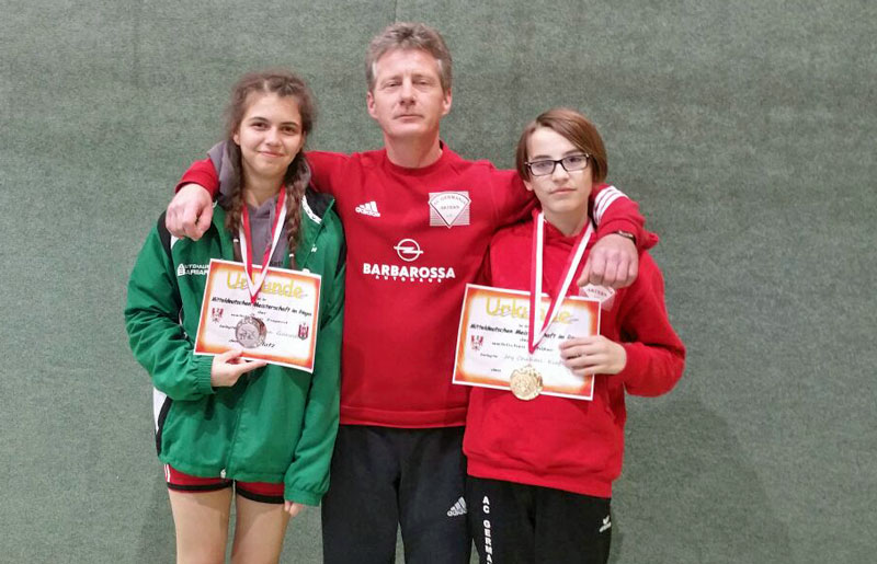 Michael Kinitz mit seinen „Medaillen-Mädels“ Katharina Gilewitsch (links) und Joy Chantal Kießler (rechts).
