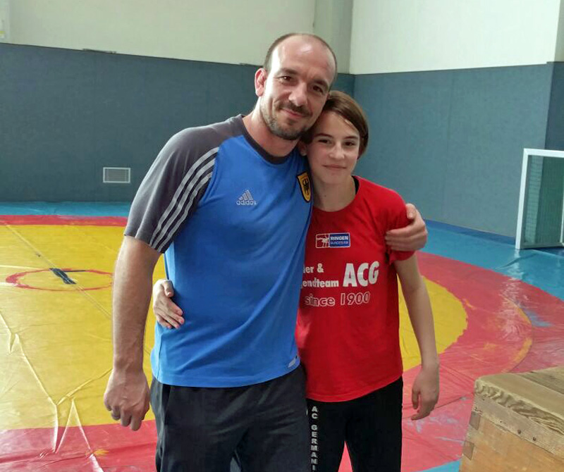 Landestrainer Felix Thätner mit Joy-Chantal Kießler nach dem Probetraining in Frankfurt.