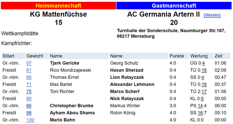 Die ersten Punkte gingen allerdings an die Mattenfüchse. Georg Schulz (57kg) gewann zwar den Kampf gegen Tjark Gericke, ging aber mit Übergewicht über die Waage. Und auch im zweiten Kampf verhinderte die Waage den Germanenerfolg, der Pole Michal Pietrzak musste über 86kg wiegen um in der Klasse bis 130kg antreten zu können. Beim Probewiegen passte alles, zum offiziellen Abwiegen zeigte die neu aufgestellte Waage dann aber deutlich weniger an und Michal durfte nicht starten.
