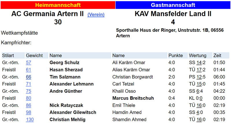 Furios begannen die Germanen, ließen auch bis zum Schluss nicht nach und feierten einen ungefährdeten 30 zu 4 Heimsieg. Einzig in der Gewichtsklasse bis 80 kg mussten die Arterner passen und Mannschaftskapitän Marcus Breitschuh holte kampflos die einzigen Zähler für die Gäste.