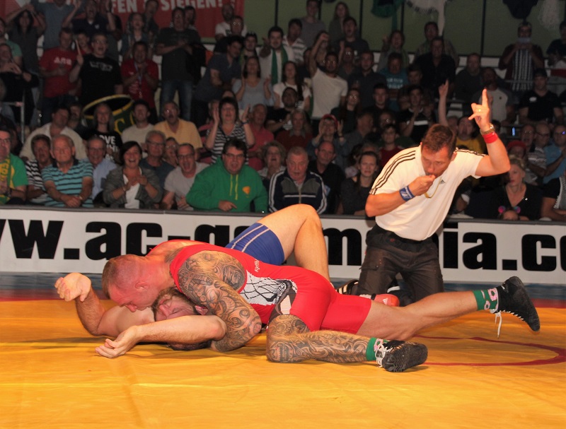 In der Gewichtsklasse bis 130 kg (Freistil) konnte Michal Pietrzak wieder mit guter Technik überzeugen. Trotz deutlichem 27 kg Gewichtsunterschied gewann er nach 1:55 Minuten gegen den schwereren Sportfreund Toni Bernhardt mit einem Schultersieg. (4:4) Das Publikum kam damit in Stimmung.