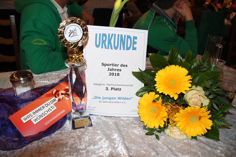 Danach wurden die Nachwuchsmannschaften der Reihe nach auf die Bühne gerufen und ebenso bejubelt von allen. Für die „Jungen Wilden“ gab es hier den 3. Platz. Sie mussten sich in der Abstimmung den Schülerteams im Volleyball (Gymnasium Sondershausen) und Crosslauf (Gemeinschaftsschule Oldisleben) geschlagen geben. Aber das trübte die Freude über den 3.Platz nicht. Auch ihnen wurden Beifall zu teil und als Interviewpartner schnappte sich Moderator Krause den jüngsten im Bunde auf der Bühne. Daniel Eisenhardt antwortete selbstbewusst und ohne Scheu. Anschließend nahm er die Urkunde entgegen.