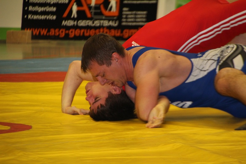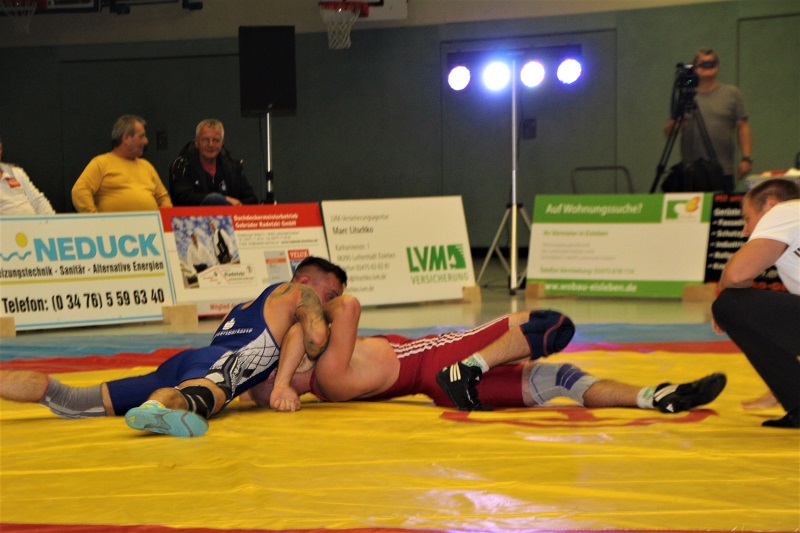 Es folgte eine kurze Erholungspause ehe es konzentriert für die Männer weiter ging. Der nächste Gegner war dann der KAV Mansfelder Land. Die Aufstellung wurde etwas geändert. Wieder gingen zwei Gewichtsklassen kampflos mit je 4 Punkten an die andere Seite. Der KAV konnte die 80kg-Freistil nicht besetzen, was Ibrahim Ismailov die Punkte kampflos sicherte. Artern konnte dafür die 71kg-Freistil nicht bedienen, was wiederum Eisleben die Punkte bescherte. Lange sollten das nachfolgend die einzigen Punkte für den KAV bleiben. Denn unsere Jungs zündeten ein Feuerwerk… Tim Salzmann kam stilartfremd zu einem Schultersieg, ihm gleich erkämpfte sich André Günther nach einer Minute den schnellsten Schultersieg des Tages. Auch Christian Mehlig, Christopher Brunke und Pascal Göbel konnten sich souverän gegen ihre Gegner mit Schultersiegen durchsetzen und sicherten so vorzeitig den Mannschaftssieg. Den Abschluss des Kampfabends bildete die Begegnung in der 75kg-Gewichtsklasse griechisch-römisch. Hier stand Jonas Michel keinem geringerem als dem Eislebener Routinier Marcus Breitschuh gegenüber. Jonas zeigte keine Angst und kämpfte bemüht gegen den deutlich erfahreneren Sportfreund. Doch er hatte ihm nichts entgegen zu setzen und geriet bereits in der ersten Hälfte in gefährliche Lage aus der er sich nicht mehr befreien konnte. Verdient gingen diese Punkte noch nach Eisleben. Doch das tat der Freude keinen Abbruch mehr. Mit 28 zu 8 holte sich Artern den Sieg in diesem Kampf, als auch in der Gruppe C nach den beiden Wettkampftagen.